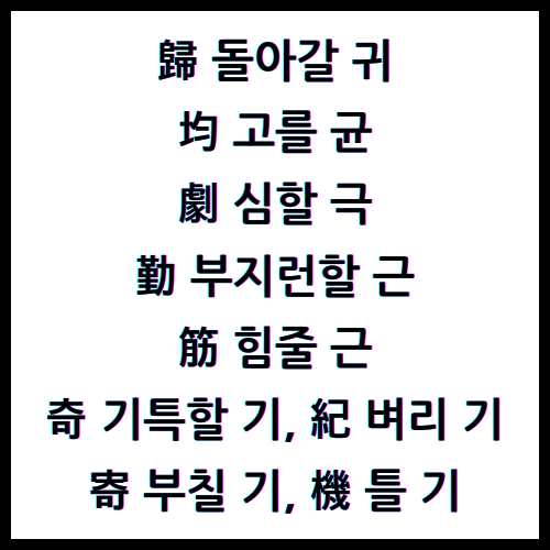 182183 歸돌아갈귀, 均고를균, 劇심할극, 勤부지런할근, 筋힘줄근, 奇기특할기, 紀벼리기, 寄부칠기, 機틀기, 한자4급