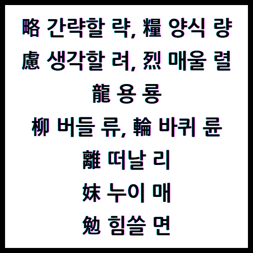 186187 略간략할략, 糧양식량, 慮생각할려, 烈매울렬, 龍용룡, 柳버들류, 輪바퀴륜, 離떠날리, 妹누이매, 勉힘쓸면, 한자4급