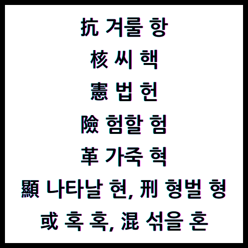 #한자 #한자8급 #한자7급 #한자6급 #한자5급 #한자4급2 #한자4급II #한자4급 #한자3급II #한자3급 #한자3급2 #한자2급 #한자1급 #특급한자 #한자특급 #8급한자 #7급한자 #6급한자 #5급한자 #4급II한자 #4급2한자 #4급한자 #3급II한자 #3급2한자 #3급한자 #2급한자 #1급한자 #한자급수 #급수한자 #한자수준 #한자글자수 #한자시험 #배정한자 #한자사전 #한자찾기 #한자검색 #한자능력검정시험 #한자어문회 #어문회 #어문회한자 #어문회특급한자 #진흥회 #진흥회한자 #진흥회특급한자 #한자진흥회 #한자진흥회기출문제 #한자어문회기출문제 #한자어문회배정한자 #어문회배정한자 #한자진흥회배정한자 #진흥회배정한자 #진흥회한자기출문제 #어문회한자기출문제 #抗겨룰항 #核씨핵 #憲법헌 #險험할험 #革가죽혁 #顯나타날현 #刑형벌형 #或혹혹 #混섞을혼 #혼동 #혼란 #혼선 #혼성 #혼용 #혼잡 #혼합 #혼혈 #혹시 #혹자 #간혹 #처형 #중형 #실형 #형벌 #감형 #극형 #사형 #발현 #현현 #현충일 #현명 #현달 #현관 #개혁 #혁신 #혁명 #혁대 #험난 #험담 #험악 #보험 #탐험 #제헌 #입헌 #개헌 #헌법 #결핵 #핵심 #핵무기 #항의 #항쟁 #대항 #반항