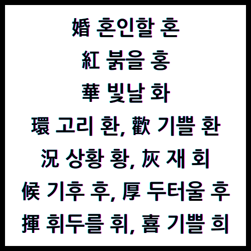 224225226 婚혼인할혼, 紅붉을홍, 華빛날화, 環고리환, 歡기쁠환, 況상황황, 灰재회, 候기후후, 厚두터울후, 揮휘두를휘, 喜기쁠희, 한자4급