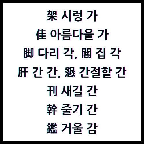 #한자 #한자8급 #한자7급 #한자6급 #한자5급 #한자4급2 #한자4급II #한자4급 #한자3급II #한자3급 #한자3급2 #한자2급 #한자1급 #특급한자 #한자특급 #8급한자 #7급한자 #6급한자 #5급한자 #4급II한자 #4급2한자 #4급한자 #3급II한자 #3급2한자 #3급한자 #2급한자 #1급한자 #한자급수 #급수한자 #한자수준 #한자글자수 #한자시험 #배정한자 #한자사전 #한자찾기 #한자검색 #한자능력검정시험 #한자어문회 #어문회 #어문회한자 #어문회특급한자 #진흥회 #진흥회한자 #진흥회특급한자 #한자진흥회 #한자진흥회기출문제 #한자어문회기출문제 #한자어문회배정한자 #어문회배정한자 #한자진흥회배정한자 #진흥회배정한자 #진흥회한자기출문제 #어문회한자기출문제 #架시렁가ː #佳아름다울가ː #脚다리각 #閣집각 #肝간간(ː) #懇간절할간ː #刊새길간 #幹줄기간 #鑑거울감 #감찰 #감정 #감식 #감상 #감별 #간부 #간선 #근간 #기간 #재간 #창간 #주간 #간행 #발간 #신간 #일간 #간곡 #간구 #간절 #간청 #간염 #간장 #충간 #구곡간장 #각하 #개각 #내각 #공중누각 #각골 #각광 #각기 #각본 #간색 #각선미 #입각 #행각 #가공 #가설 #고가 #서가 #십자가 #가객 #가경 #가약 #가일 #가작 #가절 #점입가경