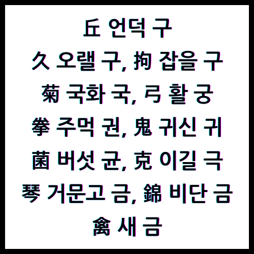 238239 丘 언덕 구, 久 오랠 구, 拘 잡을 구, 菊 국화 국, 弓 활 궁, 拳 주먹 권, 鬼 귀신 귀, 菌 버섯 균, 克 이길 극, 琴 거문고 금, 錦 비단 금, 禽 새 금
