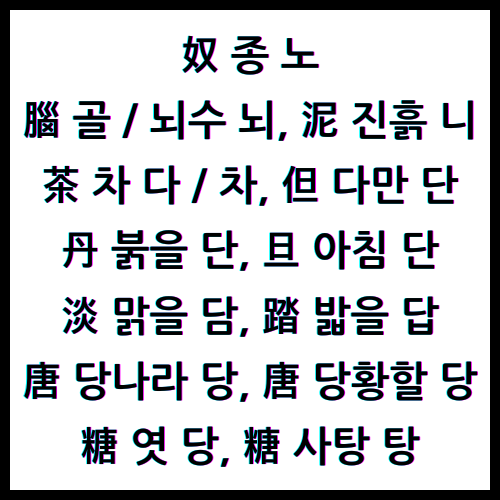 #한자 #한자8급 #한자7급 #한자6급 #한자5급 #한자4급2 #한자4급II #한자4급 #한자3급II #한자3급 #한자3급2 #한자2급 #한자1급 #특급한자 #한자특급 #8급한자 #7급한자 #6급한자 #5급한자 #4급II한자 #4급2한자 #4급한자 #3급II한자 #3급2한자 #3급한자 #2급한자 #1급한자 #한자급수 #급수한자 #한자수준 #한자글자수 #한자시험 #배정한자 #한자사전 #한자찾기 #한자검색 #한자능력검정시험 #한자어문회 #어문회 #어문회한자 #어문회특급한자 #진흥회 #진흥회한자 #진흥회특급한자 #한자진흥회 #한자진흥회기출문제 #한자어문회기출문제 #한자어문회배정한자 #어문회배정한자 #한자진흥회배정한자 #진흥회배정한자 #진흥회한자기출문제 #어문회한자기출문제 #奴종노 #腦골뇌/뇌수뇌 #泥진흙니 #茶차다/차차 #但다만단ː #丹붉을단 #旦아침단 #淡맑을담 #踏밟을답 #唐당나라당/당황할당(ː) #糖엿당 #糖사탕탕 #설탕 #사탕 #혈당 #제당 #당분 #당관 #당돌 #당시 #답보 #답사 #답습 #고답적 #전인미답 #담수 #냉담 #아담 #원단 #일단 #단서 #비단 #단심 #단청 #목단 #녹차 #다방 #다도 #다기 #이토 #운니지차 #이수 #이공 #세뇌 #두뇌 #뇌사 #뇌리 #노비