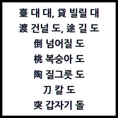 244245 臺 대 대, 貸 빌릴 대, 渡 건널 도, 途 길 도, 倒 넘어질 도, 桃 복숭아 도, 陶 질그릇 도, 刀 칼 도, 突 갑자기 돌
