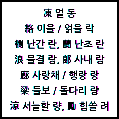 246247 凍 얼 동, 絡 이을 락, 絡 얽을 락, 欄 난간 란, 蘭 난초 란, 浪 물결 랑, 郞 사내 랑, 廊 사랑채 랑, 廊 행랑 랑, 梁 들보 량, 梁 돌다리 량, 涼 서늘할 량, 勵 힘쓸 려