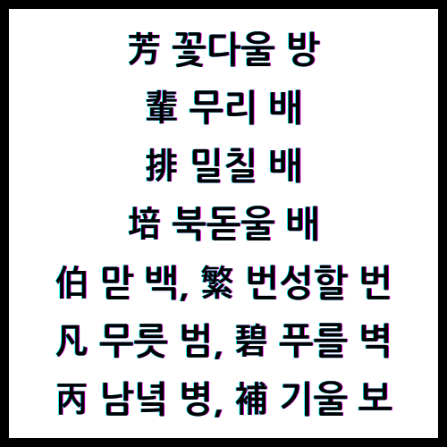 262263 芳 꽃다울 방, 輩 무리 배, 排 밀칠 배, 培 북돋울 배, 伯 맏 백, 繁 번성할 번, 凡 무릇 범, 碧 푸를 벽, 丙 남녘 병, 補 기울 보