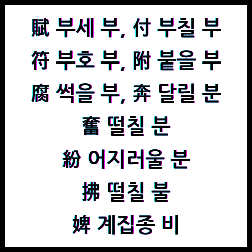 266267 賦 부세 부, 付 부칠 부, 符 부호 부, 附 붙을 부, 腐 썩을 부, 奔 달릴 분, 奮 떨칠 분, 紛 어지러울 분, 拂 떨칠 불, 婢 계집종 비