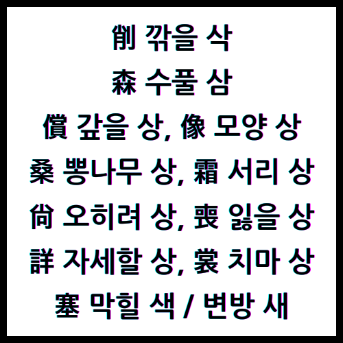 #削깎을삭 #森수풀삼 #償갚을상 #像모양상 #桑뽕나무상 #霜서리상 #尙오히려상(ː) #喪잃을상(ː) #詳자세할상 #裳치마상 #塞막힐색 #塞변방새 #삭감 #삭발 #삭제 #삼림 #삼엄 #상환 #보상 #가상 #기상 #동상 #불상 #상상 #영상 #잔상 #허상 #상엽 #상전 #상전벽해 #상해 #성상 #풍상 #만고풍상 #설상가상 #상궁 #고상 #숭상 #상가 #상례 #상복 #상실 #상심 #문상 #초상 #상세 #상술 #미상 #의상 #동가홍상 #궁색 #폐색 #요새 #발본원색 #한자 #한자8급 #한자7급 #한자6급 #한자5급 #한자4급2 #한자4급II #한자4급 #한자3급II #한자3급 #한자3급2 #한자2급 #한자1급 #특급한자 #한자특급 #8급한자 #7급한자 #6급한자 #5급한자 #4급II한자 #4급2한자 #4급한자 #3급II한자 #3급2한자 #3급한자 #2급한자 #1급한자 #한자급수 #급수한자 #한자수준 #한자글자수 #한자시험 #배정한자 #한자사전 #한자찾기 #한자검색 #한자능력검정시험 #한자어문회 #어문회 #어문회한자 #어문회특급한자 #진흥회 #진흥회한자 #진흥회특급한자 #한자진흥회 #한자진흥회기출문제 #한자어문회기출문제 #한자어문회배정한자 #어문회배정한자 #한자진흥회배정한자 #진흥회배정한자 #진흥회한자기출문제 #어문회한자기출문제